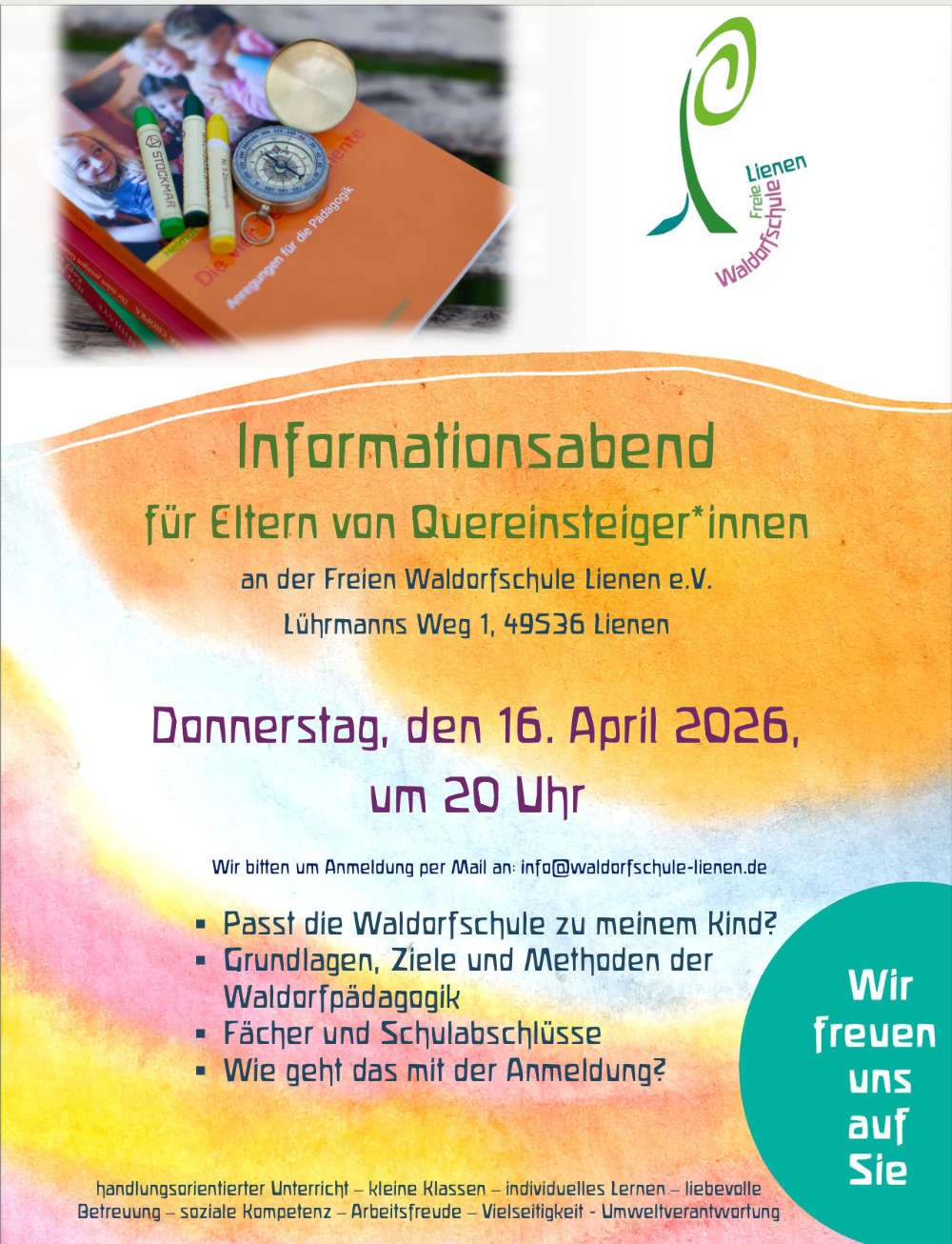 Wenn Sie teilnehmen möchten, melden Sie sich bitte an unter info@waldorfschule-lienen.de