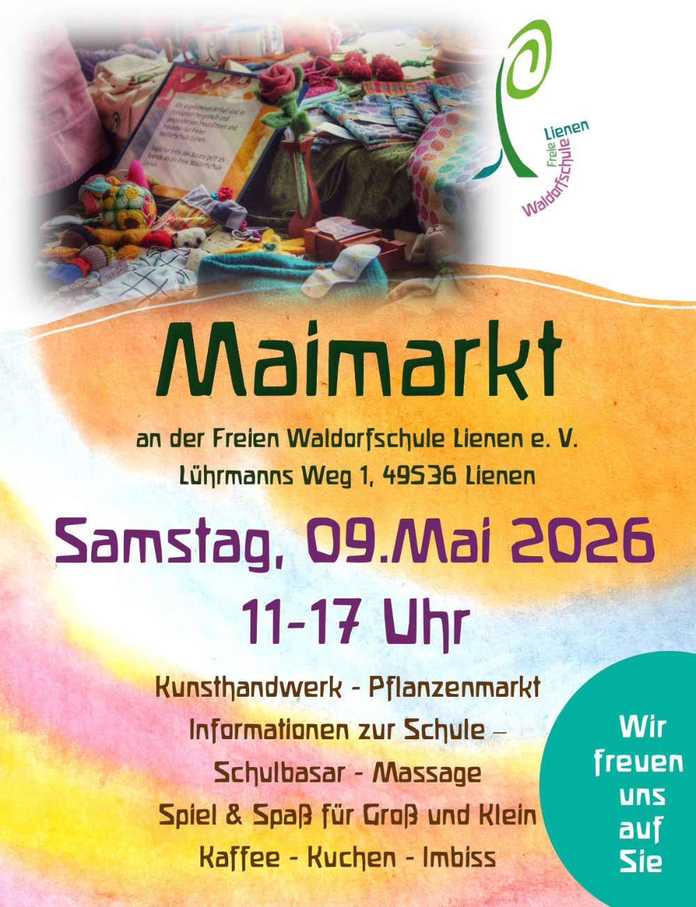 Am 9. Mai um 11 Uhr öffnet wieder unser beliebter Maimarkt seine Pforten auf dem Gelände der Waldorfschule Lienen. Neben einem Kunsthandwerk- und Pflanzenmarkt, finden Interessierte einen Schulbasar, Massagen, Informationen zur Schule sowie Kaffee, Kuchen und Snacks. Kurzum: Spiel und Spaß für Groß und Klein. Wir freuen uns auf Euren Besuch.